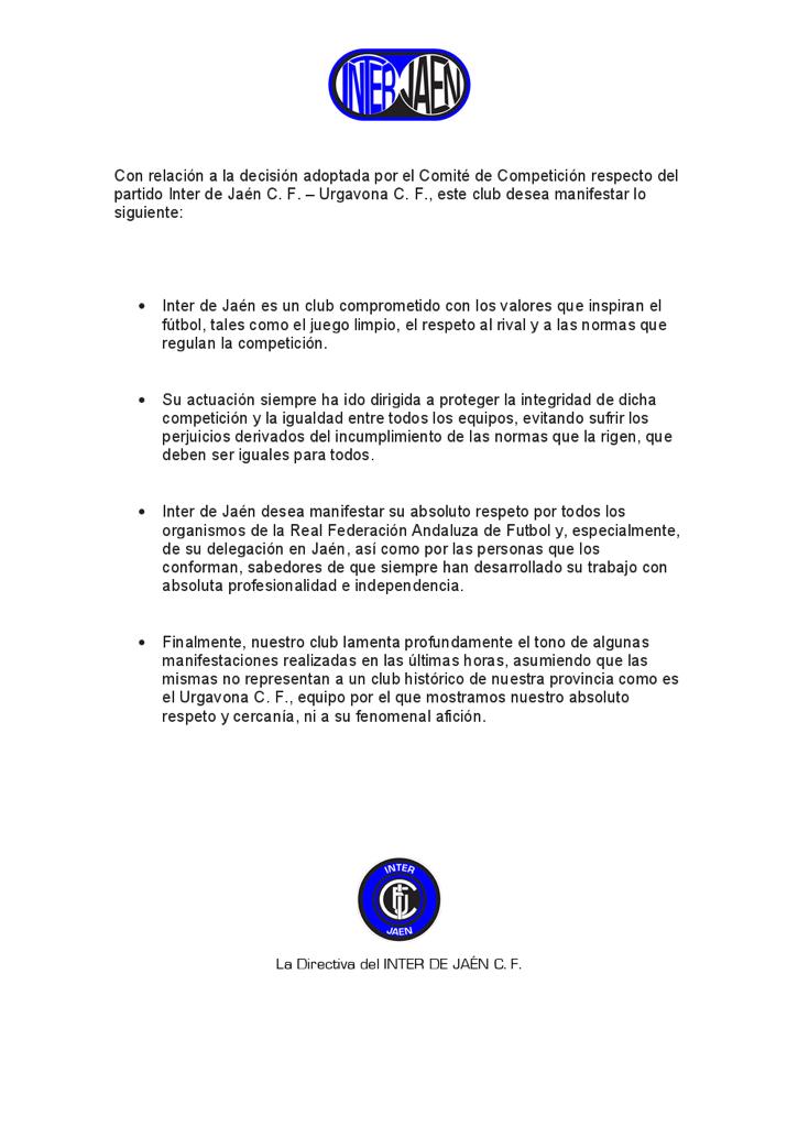 En referencia a la resolución del Comité de Competición acerca del partido Inter de Jaén C.F. - Urgavona C.F., lanzamos el siguiente comunicado, no sin antes expresar nuestro respeto total tanto a los organismos e instituciones que vienen desarrollando su trabajo de manera profesional para que se cumplan las normas, como al resto de clubs que las vienen respetando y que forman parte de la competición de este deporte que tanto amamos.
