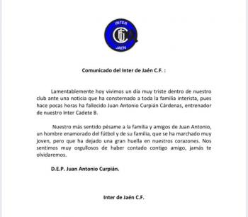 Desde nuestro club y particularmente nuestra Academia Inter de Jaén de fútbol base lamentamos esta pérdida y enviamos todo nuestro apoyo y un abrazo muy grande para su familia: Luzma, Juan Diego, Aitor y la pequeña Luzma.